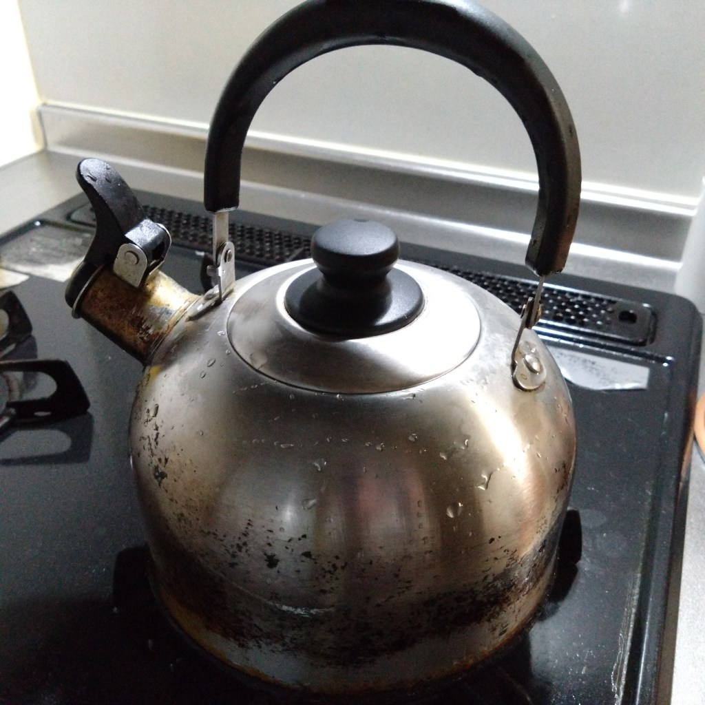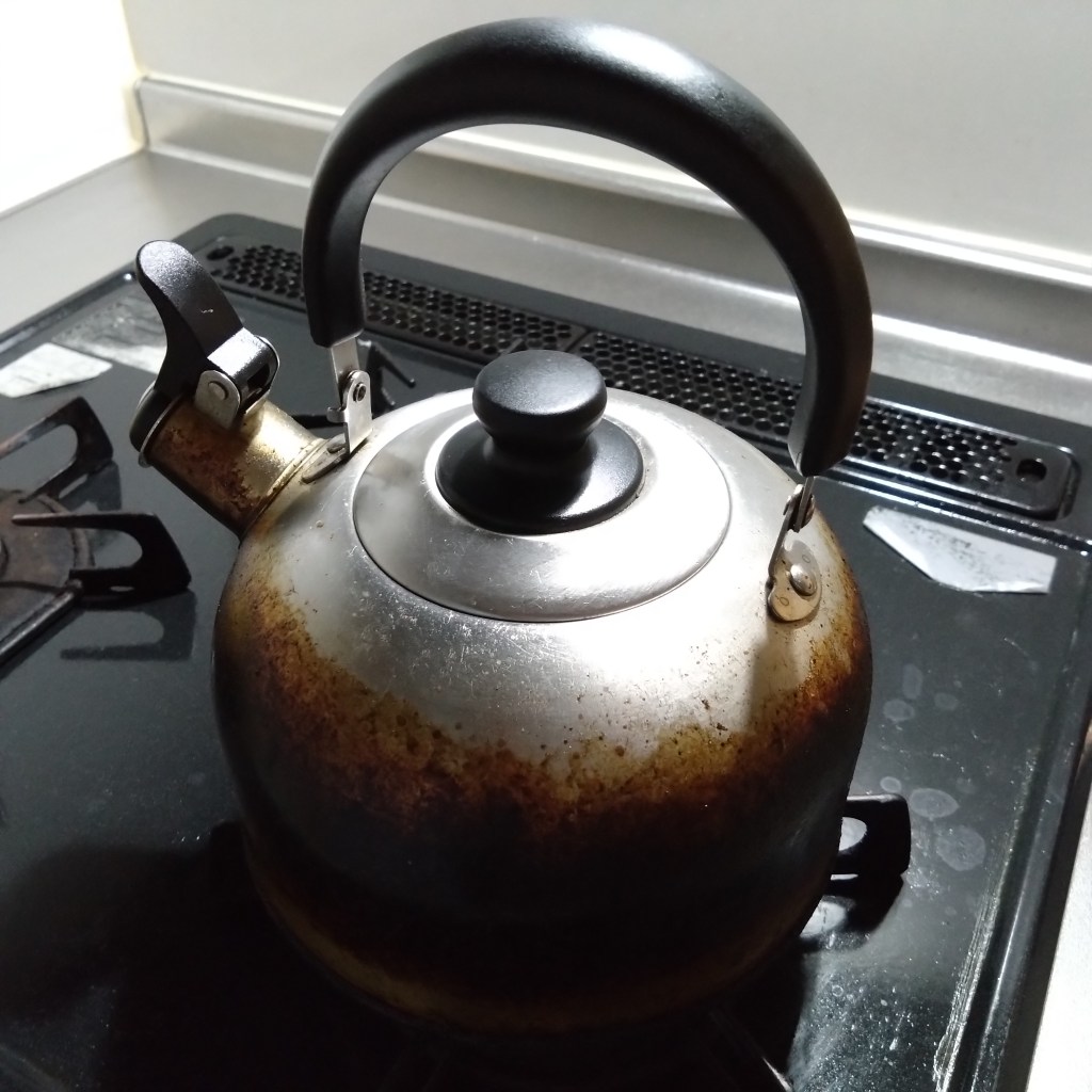 おはようございます。ステンレス製のやかんでお湯を沸かした際、「やかんの外側汚いな……」と感じたくどうです。今回はこのやかんの焦げつきを重曹の力できれいにしていきます。