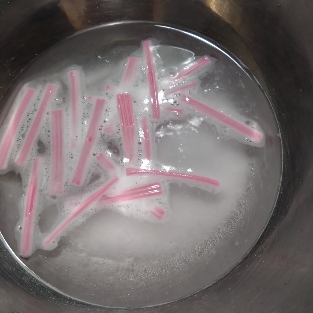 ②お湯250mlに重曹大さじ3を混ぜて、よくかき混ぜます。先ほどのグミを入れます。