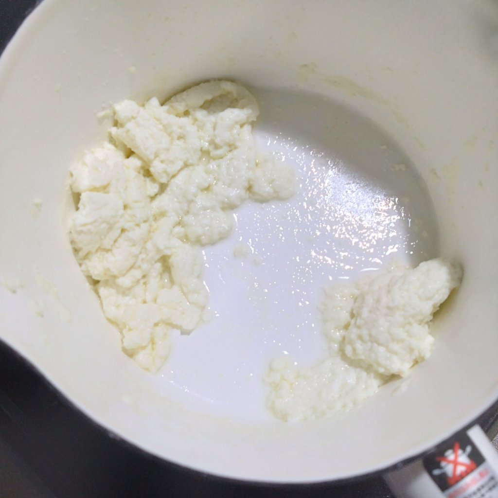 ③ こし器でホエー(乳清)からカードを漉し、カードを冷まして水分をしぼり、ボウルに移します。